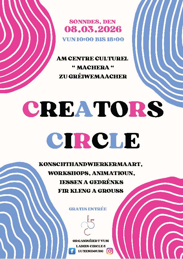Join us at the Creators Circle, a vibrant craft market organized by Ladies Circle 5 Osten Luxembourg on Sunday, March 8, 2026, from 10:00 to 18:00 at the Centre Culturel Macherä in Grevenmacher.